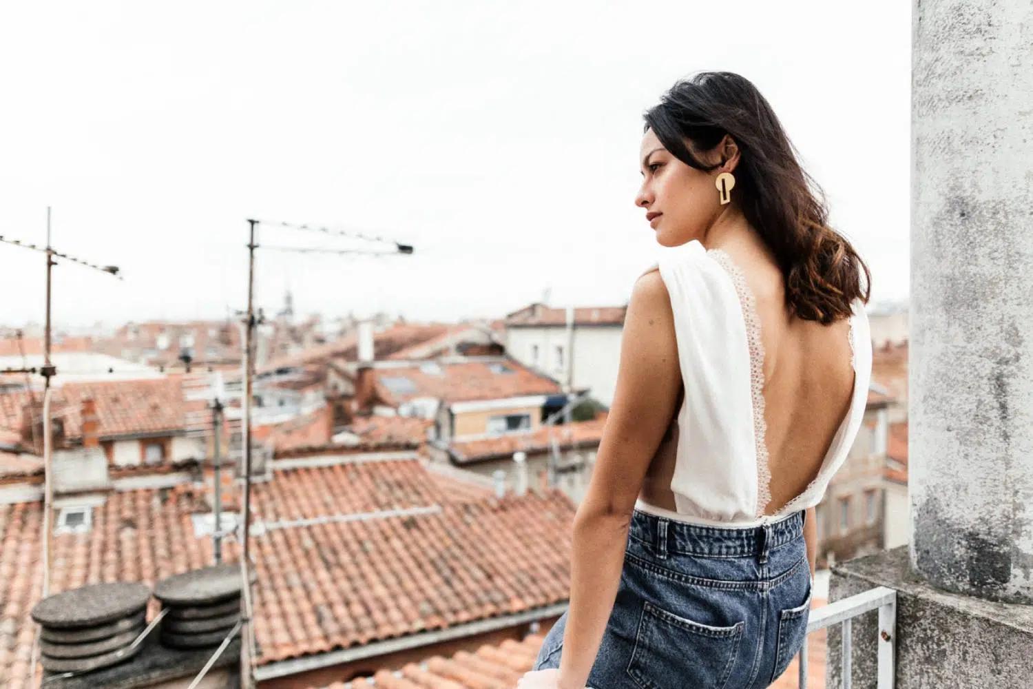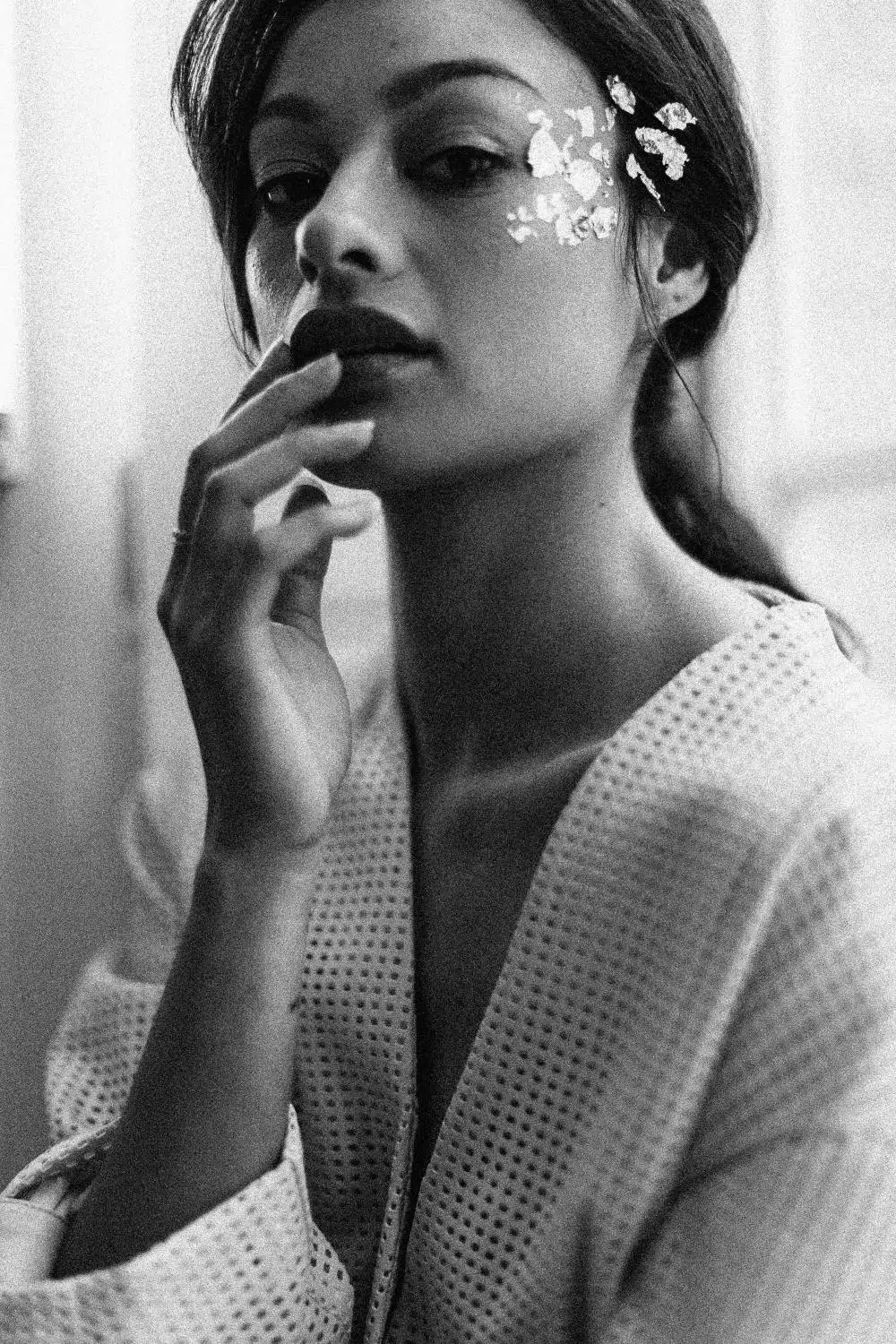 Un maquillage lumineux et des cheveux naturels, rien de plus pour notre beau modèle. Avec la photographe, nous avions une envie commune, faire un shooting essentiellement de portrait. Puis pour finaliser ce beau projet, le maquillage a évolué. J’ai sublimé sa jolie peau par des feuilles d’or. Cassandre s’est laissée porter et nous sommes ravies du résultat.